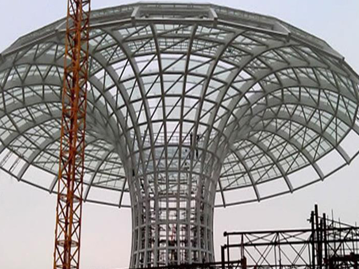 二、球形网架结构因其结构新颖,受力合理,自重轻、用钢量低等优点。如大型体育场馆球形高平螺栓球网架、公共场馆球形网架、电厂高平螺栓球网架、水泥工业球形网架、仓储物流球形网架、高平干煤棚工业球形网架、高平收费站高平加油站球形网架、展览中心、影剧院、商场、航站楼、候车厅、工厂高平车间、仓库、电视塔等球形螺栓球节点网架。国内球形网架结构主要分为:高平焊接球节点网架及螺栓球节点网架两种。螺栓球节点网架其构件工厂内加工量较大,现场安装便捷,适用于现场工期紧,高平施工条件、用电量受制约,网架形状复杂、高平杆件定位困难的异形结构。螺栓球节点球形网架系统基本由高平杆件、螺栓球、支撑支座等组成。按照节点形式可分为交叉高平桁架体系、四角锥体系、三角锥体系等。支撑方式多为固定支座支撑。对于大面积、大跨度及有特殊受力或伸缩要求的网架结构可采用橡胶支座、滑移支座、球铰支座等支撑形式,以满足结构自身的受力稳定、均衡,便于内力释放等设计要求。